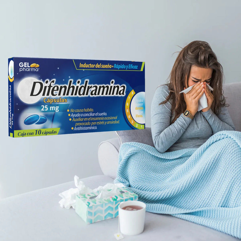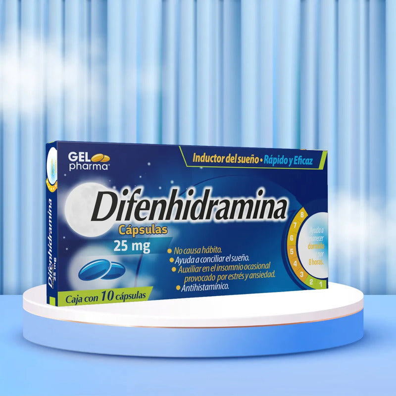Bienvenidos a la Tienda Oficial de Gel Pharma operada por Halomedic. Nombre del medicamento: DIFENHIDRAMINA Principio Activo: Difenhidramina Dosis unitaria: 25 mg Presentación: Cápsulas Unidades por empaque: 10 Cápsulas Unidades totales: 5 cajas con 10 cápsulas c/u ---------------------------------------------------- Consulte a su médico. Evite la automedicación. Halomedic no recomienda ni sugiere el consumo de ningún medicamento. Lo mostrado en esta página es solamente informativo. + En caso de requerir factura, encontrará un link en el chat de compra para realizarla. + En medicamentos no hay cambios ni devoluciones para garantizar la seguridad del producto.