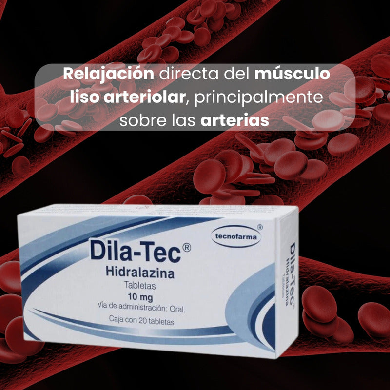 Bienvenidos a la tienda oficial de HALOMEDIC. Nombre del medicamento: DILA-TEC Principio activo: HIDRALAZINA Dosis unitaria: 10 mg Presentación: Tabletas Unidades por empaque: 20 Tabletas DILA-TEC®, (Hidralizina) es un vasodilatador de acción directa que se usa para tratar la presión arterial alta, relajando los vasos sanguíneos para que la sangre fluya más fácilmente a través del cuerpo. ---------------------------------------------------- Consulte a su médico. Evite la automedicación. Halomedic no recomienda ni sugiere el consumo de ningún medicamento. Lo mostrado en esta página es solamente informativo. + En caso de requerir factura, encontrará un link en el chat de compra para realizarla. + En medicamentos no hay cambios ni devoluciones para garantizar la seguridad del producto.