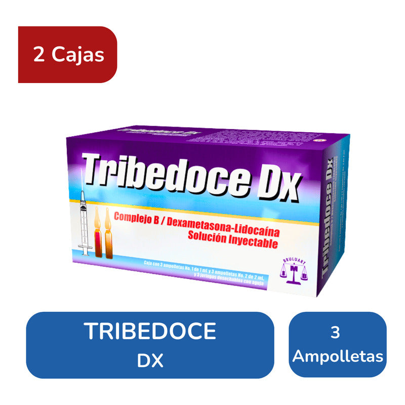 Bienvenidos a la Tienda Oficial de Halomedic. Nombre del medicamento: TRIBEDOCE DX Principio activo: Comlejo B (Tiamina, Piridoxina, Cianocobalamina) / Lidocaína / Dexametasona Dosis unitaria: Complejo B (100 mg, 100 mg, 5 mg) / 30 mg / 4 mg Presentación: Solución inyectable Unidades: 3 ampolletas No. 1 de 1 mL y 3 Ampolletas No. 2 de 2 mL con 3 jeringas desechables. Unidades Pack: 2 cajas. _________________________________ Consulte a su médico. Evite la automedicación. Halomedic no recomienda ni sugiere el consumo de ningún medicamento. Lo mostrado en esta página es solamente informativo. + En caso de requerir factura, encontrará un link en el chat de compra para realizarla. + En medicamentos no hay cambios ni devoluciones para garantizar la seguridad del producto. Sin garantía = Dolor =